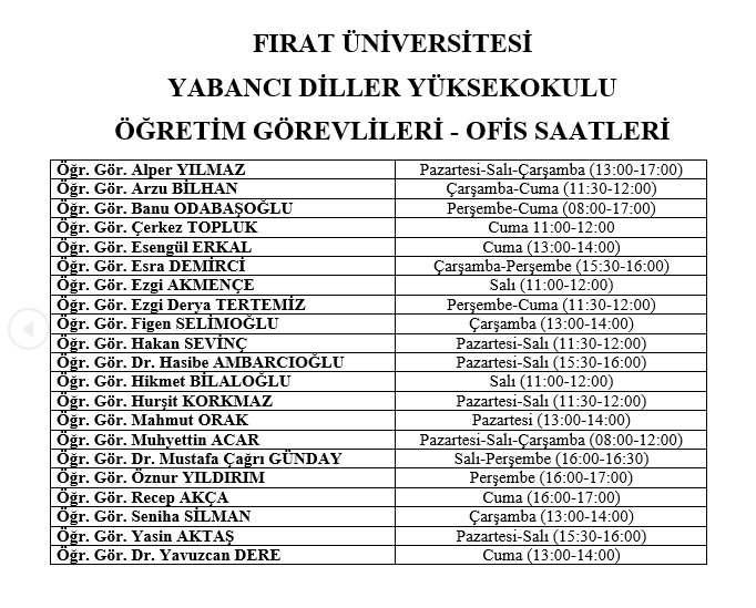 Yüksekokulumuz Öğretim Görevlilerinin ofis saatleri aşağıdaki gibidir.